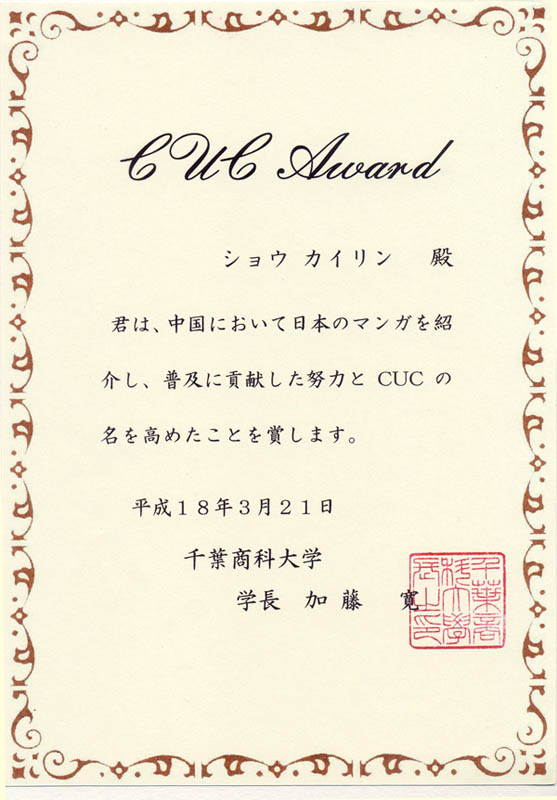 日本千叶商科大学毕业并获得学校颁发的荣誉奖。