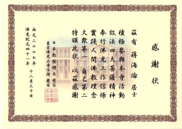 临济宗日本东京佛光山禅寺,特授结善缘鼓励奖状